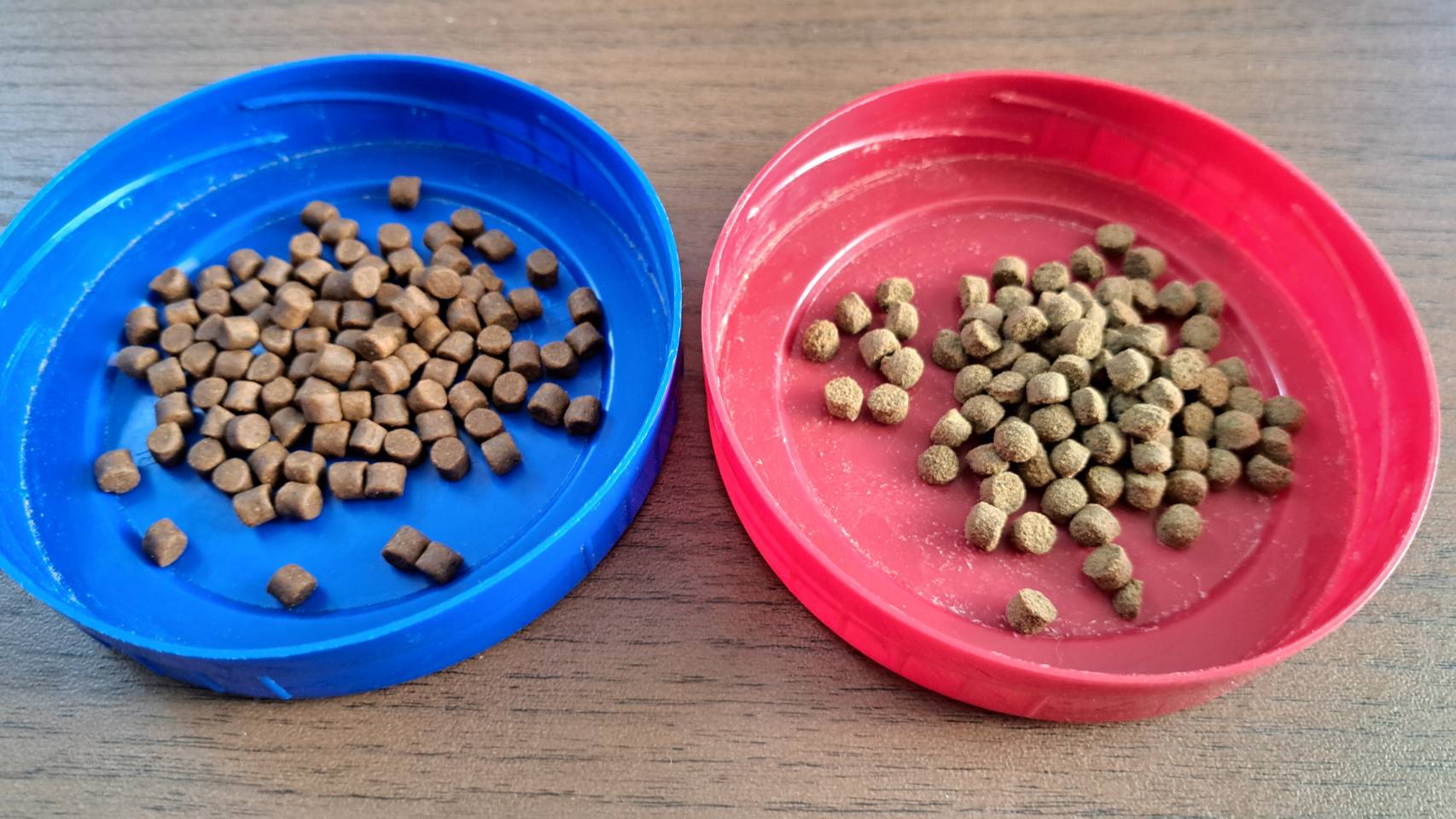 (写真ー青:咲ひかり サイズM/赤:オトヒメ サイズEP6→いずれも鯉用の餌だがネオケラにもあげれます)